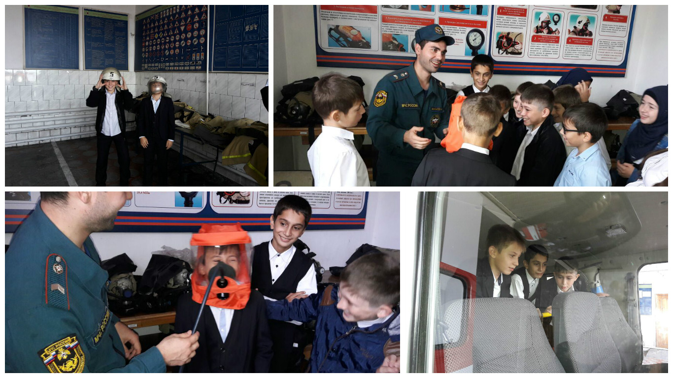 Экскурсия на пожарную часть, где представители пожарной части продемонстрировали современные устройства для тушения пожара, приемы надевания элементов защитного снаряжения и противогаза. Представитель пожарной части предложили участникам посмотреть различные спасательные (пожарные) приемы, а также до учащихся довилась информация о правилах безопасного поведения детей в условиях наступающих летних каникул. Далее были продемонстрированы приемы надевания элементов защитного снаряжения и противогаза и желающие учащиеся повторили данный прием самостоятельно.