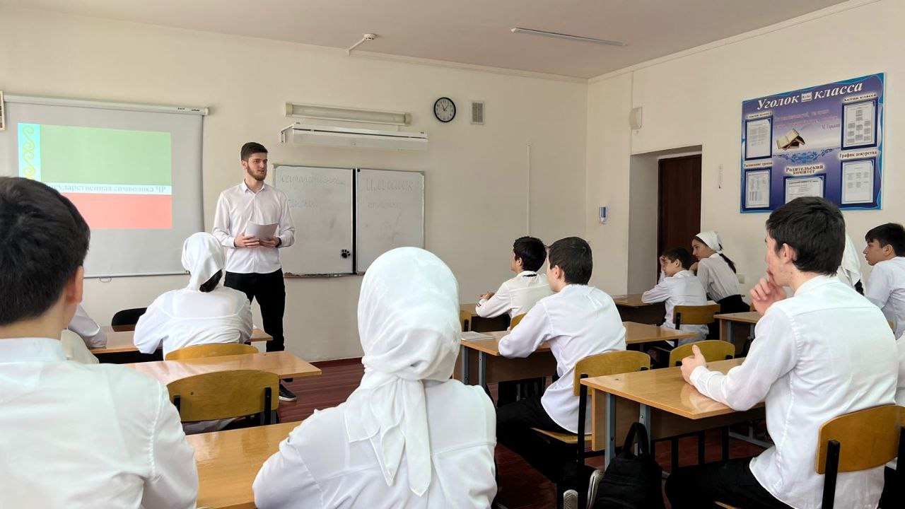 15.03.2023Беседа была проведена в рамках мероприятий, приуроченных Дню Конституции Чеченской Республики, с целью ознакомления учащихся с государственной символикой Чеченской Республики.