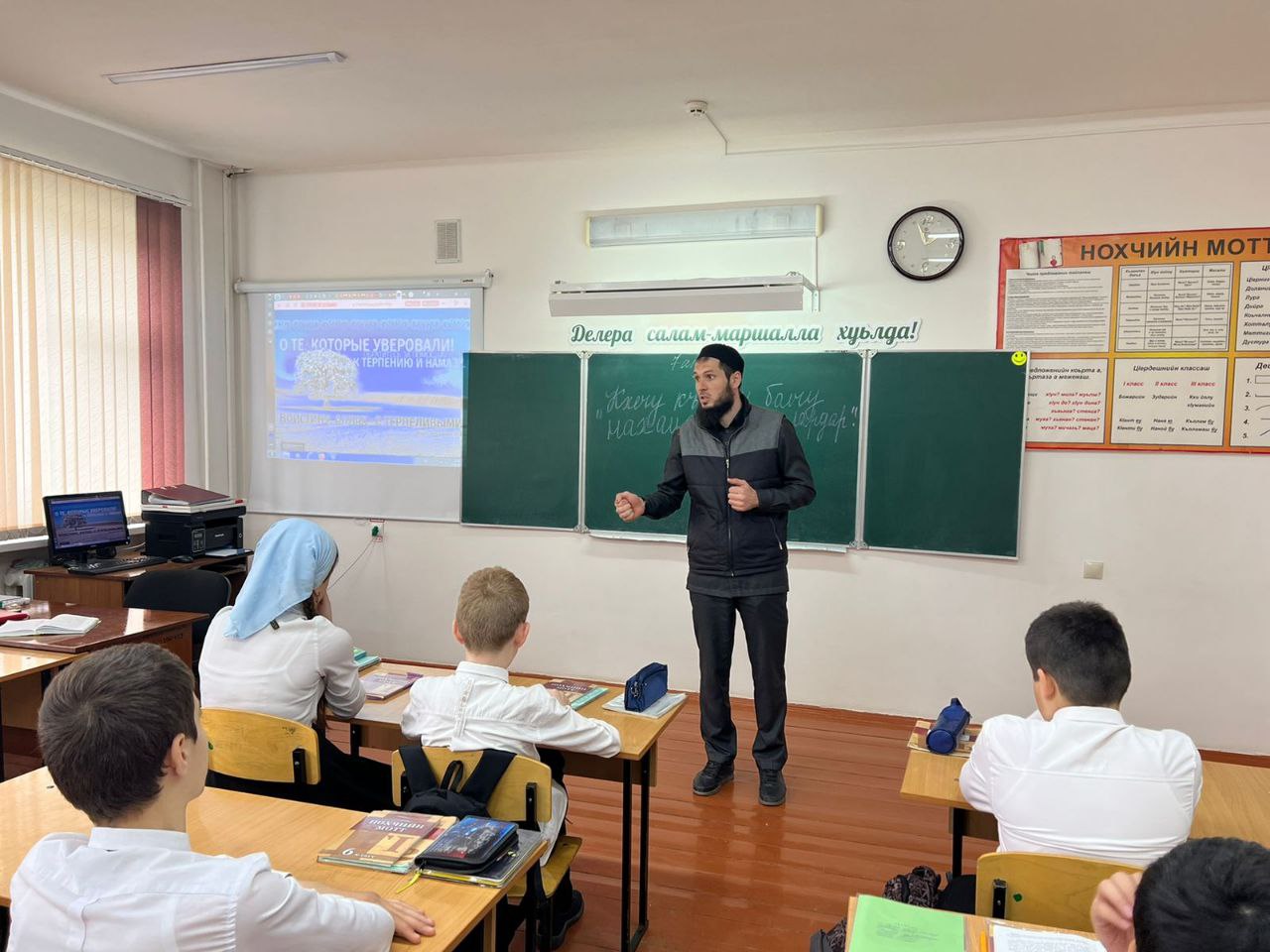 Педагог по ДНВ Магомадов А.Р. провел беседу с учащимися 6в класса на тему "Кхечу къоман болчу нахаца г1иллакх лардар"