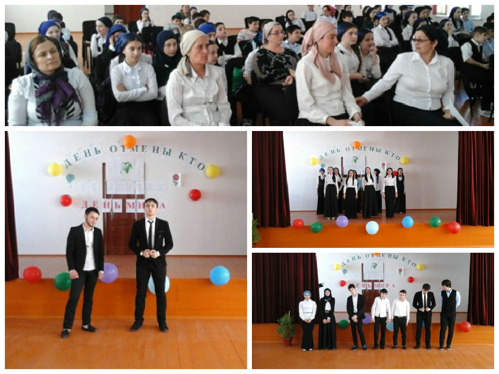 В МБОУ «СОШ №17» состоялось открытое мероприятие, посвященное Дню Мира. В мероприятии были использованы слайды «Жизнь республики вчера и сегодня». Учащиеся читали стихи, пели песни, посвященные родной Чечне.