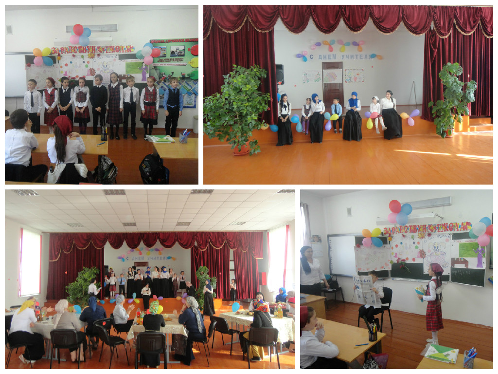 3.10.15г. классный руководитель 9б класса Амсиева Э.Р. организовала и провела праздничный концерт ко Дню Учителя «Учительские посиделки». Мероприятие было организовано в форме «Кафе для учителей», меню которого состояло из поздравительных номеров. Как и в любом кафе, блюда были платными, но оплачивались не деньгами, а участиями в различных конкурсах и играх. Особо понравилась всем инсценировка сказки «Репа», главными героями которого играли учителя.Мероприятие прошло на высшем уровне. Все участники концерта остались довольны.